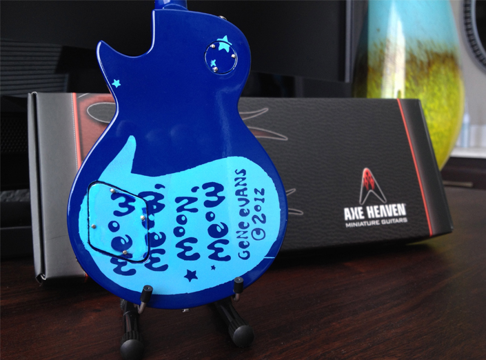 One has to wonder where AXE HEAVEN® comes in on this massive project? Gene Evans knew his labor of love would soon be gone and displayed for the Waukesha Guitar Town Project, so he wanted a little something to remember his amazing axe! That is when Gene found us! We create with out question the coolest product on earth! Okay thats a bit much, but for some people it really is pretty much the best thing ever. We replicated the 10′-Foot monster Meow Meow, Moon, Meow guitar into a 10″-Inch miniature guitar handcrafted from solid wood. The process was about the same only on a much smaller scale. We captured every detail by hand airbrushing and painting from the photos that were sent over.