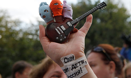 A Pussy Riot supporter holds finger puppets of the punk band outside the courthouse where they were sentenced to two years in jail. The sign on her wrist reads: ‘They are your children, Russia.’ Photograph: Alexander Zemlianichenko/AP. The supporter is rockin a AXE HEAVEN mini guitar! ROCK YOUR PASSION! Free the Pussy Riot Girls! Check out some cool pictures below of supporters showing their support!