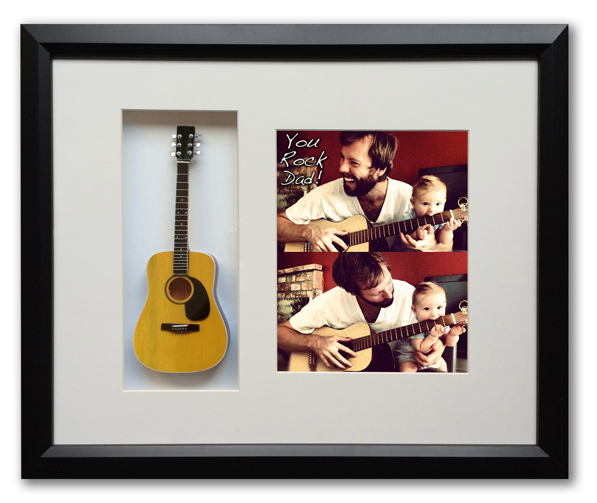 AXE HEAVEN is introducing a personalized guitar themed gifts that are completely custom. Our personalized 22″ x 19″ Mini Guitar Framed Shadow Box – Make your dad feel like a rock star on Father’s Day! Each custom shadow box is framed with solid wood and real glass. Select from over 100 stock mini guitars. Email us your personal photo & personal message, and our designers can add that special note in the shadow box with your choice of mini guitar. This is the perfect gift for a father and musician.
