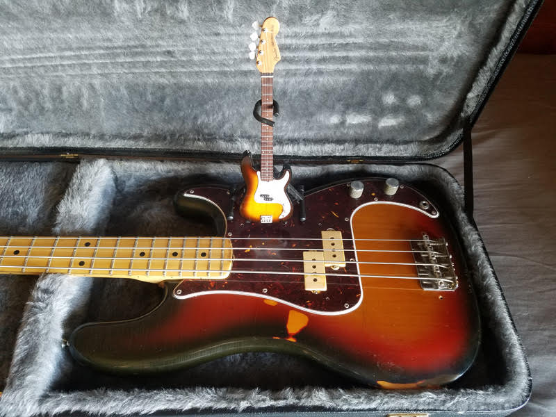 Can you believe we even have guitar wall mounts for these mini guitars? The photo of the Sunburst Jazz Bass hanging next to the real size version is simply joyous to me!