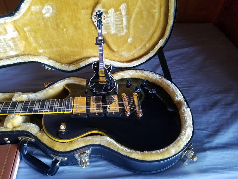I got these gorgeous photos from a fan that has two collections of guitars…the real thing and miniatures! He has 11 real size guitars, 5 Fenders, 2 Ibanez, the Black Beauty, a BC Rich, an Ovation and a Takamine classical, and now he’s trying to match all of the big ones with our miniatures. So far he has the Gibson Ebony Les Paul (aka Black Beauty), Fender Precision Bass, and a Red Fender Stratocaster. I can’t wait to see what else I can find to match the rest of his collection, I’ll be getting photos soon!