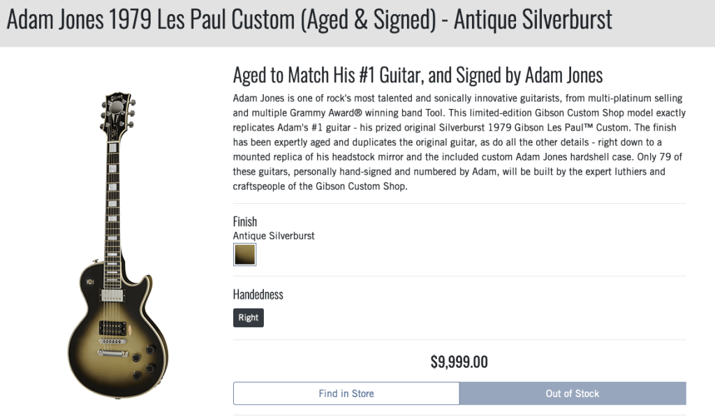 In October of 2020, Adam Jones, the famous founder and guitar player for the iconic band Tool, got together with Gibson, the most iconic guitar brand, and released his 1979 Les Paul Custom in Antique Silverburst guitars in both the VOS (vintage original spec) and the Aged version which Adam signed. Adam introduced The Adam Jones Les Paul Custom in Antique Silverburst by composing and performing the song/short film entitled The Witness than can be seen on YouTube here: https://youtu.be/0ukDsv3pweo